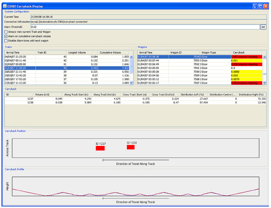 An initial research project was funded by the Australian Coal Association Research Program (ACARP) to investigate the extent of carryback present in coal wagons from various central Queensland coal mines. This project developed a new wagon inspection system that was employed at a coal terminal in Gladstone on the central Queensland coast. The detection system was designed to scan the coal wagons after dumping using a two-dimensional (2D) laser scanner (lidar), and then analyse the resulting data to estimate the extent and distribution of the carryback for each wagon. This research project culminated in a six-month survey of all wagons emptying at one of the terminal’s three dump stations, and delivered a statistically robust picture of the extent and variation of carryback across the Bowen Basin mines that shipped product via Gladstone [15]. Beyond the immediate benefit, the data collected and analysed by the system may contribute to the wider mining value chain, informing improved processes at both the mine and port stages of operation.