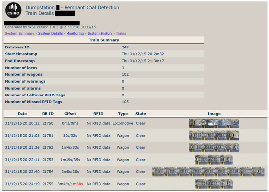 Although the RCD system did not feature a standalone GUI (since it was designed to be integrated into the client’s plant control system), a web interface (Figure 7) to the system was developed to provide the client with the ability to interrogate the historical data associated with particular trains and wagons. This interface provides access to previously scanned wagons, and includes information on the presence of hang-ups, with wagons classified according to their scanned contents as either a clear, warning, or alarm situation. Thumbnail images for each wagon are also recorded, so that operators can examine the circumstances that led to a particular warning or alarm situation, and potentially adjust the detection thresholds to improve the system’s response in accordance with operational policy on the level of acceptable remnant coal. Each thumbnail image links to a full resolution image for closer examination if required.