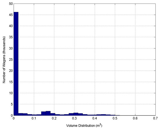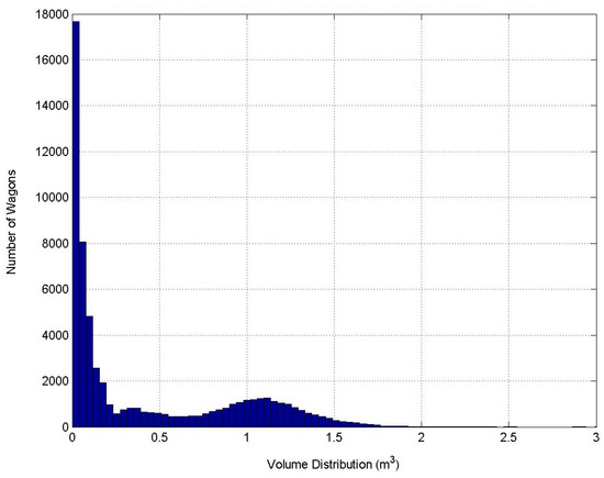 For the six-month period of the study, the mean total carryback was 0.359 tonnes per wagon, and the mean KDD carryback was 0.049 tonnes per wagon. Based on an average train frequency of 4.5 trains per day through the dump station, this equated to a total of approximately 61,000 tonnes per year of total carryback, including approximately 8400 tonnes per year of KDD carryback. Figure 8 shows the volume distribution for the total measured carryback during the six-month survey, and Figure 9 shows the KDD carryback for the same period [15].