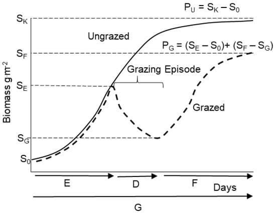 total seasonal production under the grazing management system, PG, is the sum of PE plus production after the grazing episode PF [23] (Figure 1).