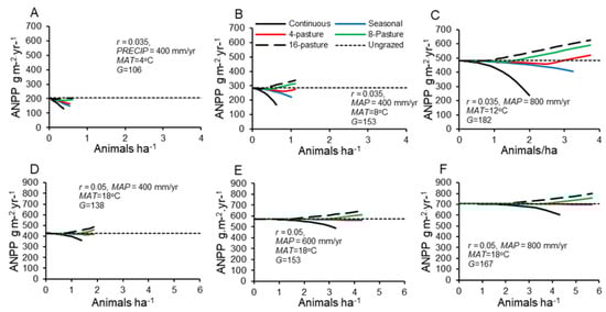 In tropical climates (MAT = 18 °C) and accompanying higher r (=0.05) [23], grassland supported much higher stocking rates and grazing enhanced production over a much wider range of precipitation and pastures per system (Figure 4). In all simulated tropical climates, systems with four or more pastures showed no decline in production relative to ungrazed conditions across the entire range of stocking densities. In tighter rotation systems (n ≥ 8 pastures) with high stocking density, forage production increased to 15% above that in ungrazed systems (Figure 4D–F).