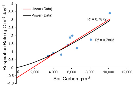 Two alternative regression lines fit to measures of microbial respiration plotted versus measured soil carbon density (data from [35]). The red line is a linear fit, while the black curve is a power function fit from a ln-ln regression. Note that extrapolation of the linear fit to low soil carbon densities results in untenable negative estimates of microbial respiration.