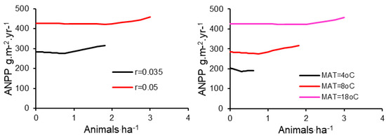 The effects of r and MAT, independently of grazing scheme (8-pasture rotation) and MAP (400 mm/year), were substantial. Increasing r by the difference between reported temperate climate values [22] and tropical climate values [23] led to a very large increase in production and stocking density (Figure 6A). Likewise, holding r constant (r = 0.035) and varying MAT yielded a dramatic increase in production and stocking density when MAT increased from 4 to 12 °C. However, a further increase in MAT had relatively little effect on sustainable stocking density and forage production (Figure 6B).