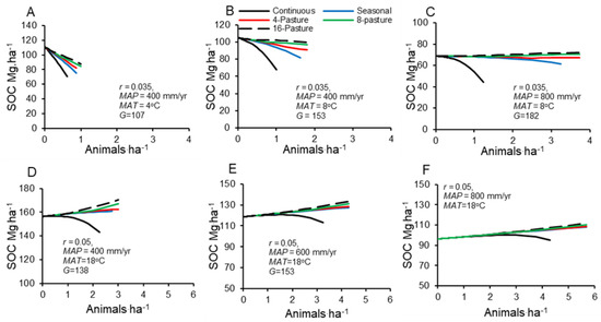 Equilibrium soil organic carbon densities (Mg ha−1) to a depth of 30 cm for different numbers of pastures and stocking densities for the entire grazing system. (A–C), temperate conditions. (D–F), tropical conditions. Note the difference in scales for (A–C) versus (D–F).