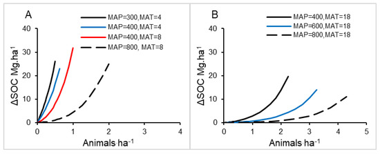 Potential change in equilibrium SOC (ΔSOC, Mg ha−1) by switching from continuous grazing management to an 8-pasture rotation at a given stocking density under varying mean annual precipitation (MAP) and temperature (MAT) in two contexts: (A), temperate conditions and (B), tropical conditions.