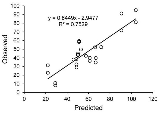 To validate the model in real grazing systems, we gathered information about history of grazing systems and then measured soil carbon and vegetation characteristics and grazing management at 24 sampling stations in south central Montana (Figure 9, Table 3). Observed SOC density ranged from near 20 g/m2 (20 cm depth) to over 120 g m−2 as influenced by whether dominant plants were perennial grasses or sagebrush (Artemisia tridentata), length of time the pasture had been at a short-duration, high stocking density grazing scheme, and type of livestock (horses, bulls, cow-calf pairs). Observed SOC density to 20 cm corresponded well to predicted SOC density given the different grazing histories and vegetation covers encountered (R2 = 0.816). The regression line between the two had a slope not significantly different from 1 (p = 0.18) and an intercept not significantly different from zero (p = 0.25).