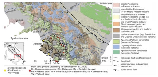 Geological map of the Southern Apennines (modified from [64]). Thick black line indicates the boundary of the Cilento, Vallo di Diano and Alburni Geopark (from [65]). White box in the southest (SE) corner of the Geopark indicates the location of Figure 2.