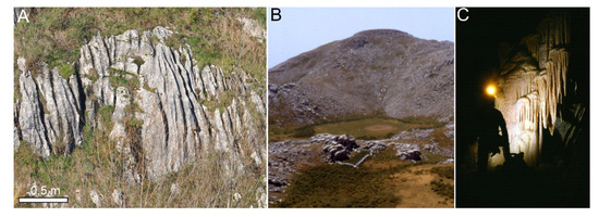 Examples of epikarst and endokarst morphologies in the Cilento, Vallo di Diano and Alburni Geopark: (A) karren; (B) doline at the summit of the Mt. Cervati peak; (C) carbonate concretion, stalactites, in a cave.