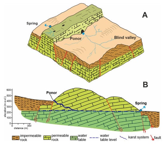 In this work, we describe some peculiar karst morphologies that originate when a karst system is fed not only by meteoric waters (autogenic karst), but also by runoff waters coming from a non-karst area (allogenic karst; [86]). This phenomenon is possible when limestone successions crop out in association with other less permeable or impermeable rocks. During meteoric events, the running waters collect on impermeable rocks and create a drainage network that flows on the surface until it meets soluble rocks. At this point, water may attack the more fractured rocks by chemical dissolution where it starts to create a concentrate infiltration point, the so-called ponor. Thus, what are ponors? They are simply holes on the Earth’s surface where streams disappear underground. They are also called swallow holes or stream-sinks. The stream waters, during geological time, are able to “dig” these holes in the carbonate rocks because they are soluble and susceptible to karst processes. This kind of ponor, located at the contact between permeable and impermeable rocks, is referred to by geologists as a “contact ponor” (Figure 4; [70]). The largest is the upstream valley, and the biggest will be the hole that the water may dig in the carbonate rocks. The drainage basin located upstream of a ponor is called the “blind valley” because it has no continuation on the surface, but it disappears underground. In association with ponors there are always cave systems (Figure 5A) that, depending on the difference in altitude between the ponor and the basal water table, may transfer the surface water towards a resurgence or may directly feed the water table (Figure 5B). This condition makes karst aquifers highly vulnerable regarding possible contamination between surface waters and underground waters [91]. Anything spilled anywhere in the catchment of a blind valley may directly reach an underground water table, even if it is very far from the spilling point.