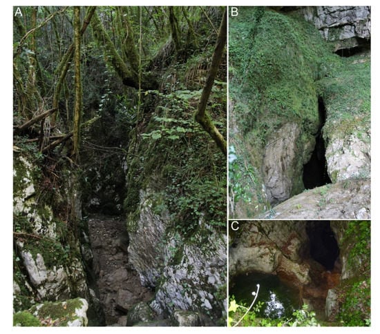 (A) Stop no. 2: the Orsivacca ponor; (B) the fossil Cozzetta ponor; (C) the active Bacuta ponor.