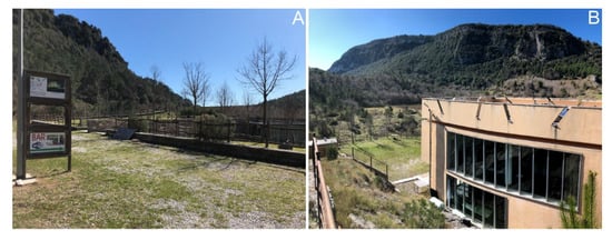 (A) Stop no. 4: the entrance of the MU. VI. (virtual museum); (B) lateral view of the MU.VI. with the eastern slope of Mt. San Michele in the background.