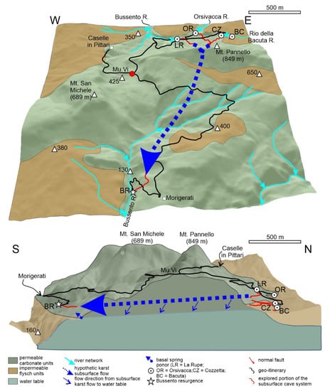 Regarding the hydrogeological setting of the area, the main aquifer is part of the carbonate structure of the Salice-Coccovello Mts, which drains towards the basal spring systems of Morigerati, located at about 90 m a.s.l., which has a total discharge of 1.5 m3/s. Hydrogeological analysis has proved a subsurface connection between the La Rupe, Orsivacca, Cozzetta, and Bacuta ponors with the Morigerati springs, that are all part of the so-called Middle Bussento Karst System [87].