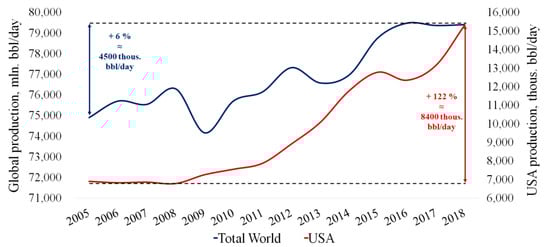 An increase of oil production volumes in the United States of America (USA) by 8410 thous. bbl/day for the period of 2015–2018, which is twice as high as total global increase in production over the same period, is a clear example of such two-track policy (Figure 2). At the same time, a major part of USA production is shale oil, which is much more cost-intensive than conventional oil. Additionally, according to the data of the State Energy Department [13], the USA has been implementing an extensive program in support of gas hydrates studies, which is related to prospective HCR.