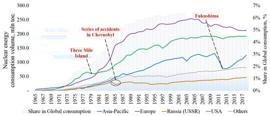 Nuclear industry, accounting for 4.5% in the global energy balance, has already made a considerable contribution to energy sector development (Figure 3), due to the relatively low cost of electricity generation [55]. The development dynamics of the nuclear energy sector differ greatly in various countries, because of varying available resources and access to alternative sources of energy, as well as project experience.