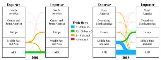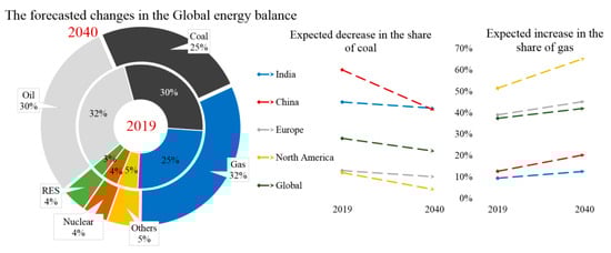 Unlike the oil and coal industries, the gas sector is on the rise and is demonstrating intensive expansion. This is due to both the cost performance of natural gas, which is slightly more expensive than oil, and environmental features. According to [92], CO2 intensity during the generation of 1 kWh of electricity from natural gas is nearly 450 g, which is almost a mean value between hydro power plants (10 g/kWh) and coal (1000 g/kWh). Therefore, natural gas is a somewhat “win–win” solution as it makes it possible to balance the interests of the “green” energy sector and hydrocarbon energy sector supporters.