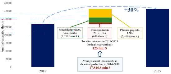 To some extent, these negative effects can be compensated by manufacturing of scientific-intensive products with high added value. Even today, oil and gas giants such as ExxonMobil (7th place in the C&EN 2018 rating of chemical companies [86]) implement large-scale investment programs in the area of chemical enterprises development (Figure 5).
