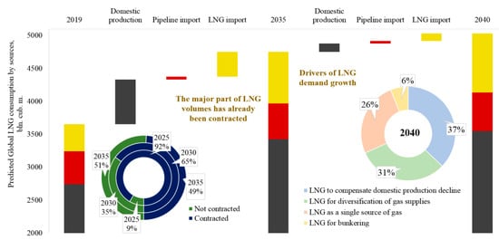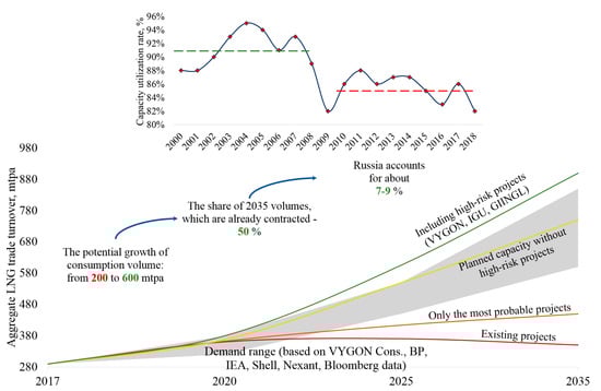 The gas industry is one of the most rapidly developing parts of the energy sector, which is mainly related to the intensive growth of capacities for the production of liquified natural gas (LNG), which have doubled every 10 years since 1998 [93]. Existing forecasts of LNG industry development provide for the increase in both demand and supply, though there is a certain probability of product surplus amounting up to 100 mln t per year [94], provided that all planned production facilities are commissioned and demand remains constant. If only the most probable projects are implemented, then by 2025 LNG shortage will amount to nearly 30 mln t. Figure 6 demonstrates these trends. Data were taken from various reports and publications of VYGON Consulting Co. [94], International Gas Union, International Group of Liquefied Natural Gas Importers (GIIGNL), and other agencies.