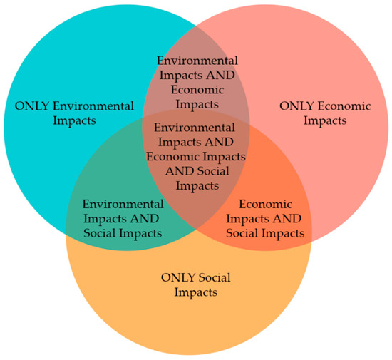Each diagram represents one component of the SWOT matrix, and is composed of three sets, one for each sustainability component. The impacts have been studied both individually (‘ONLY Environmental Impacts’; ‘ONLY Economic Impacts’; ‘ONLY Social Impacts’), in pairs (‘Environmental Impacts’ AND ‘Economic Impacts’; ‘Environmental Impacts’ AND ‘Social Impacts’; ‘Economic Impacts’ AND ‘Social Impacts’) and grouped together (‘Environmental Impacts’ AND ‘Economic Impacts’ AND ‘Social Impacts’).
