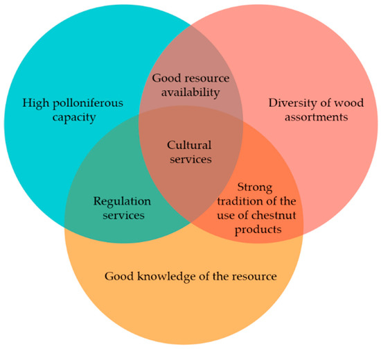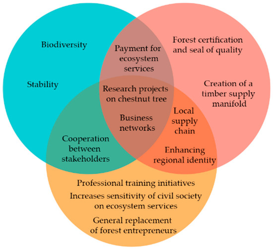 In the context of this study, the SWOT analysis was driven by the three components of sustainability, considering the environmental, societal and economic impacts related to the use and management of the chestnut tree resource, also highlighting their interrelationships. Subsequently, the results were collected in a matrix and graphically represented using Venn diagrams (Figure 1).