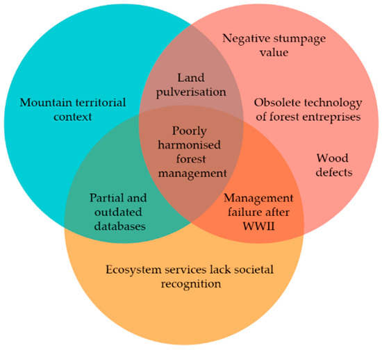 Finally, as reported by Pettenella and Secco [44] there is a general lack of societal recognition and a lack of knowledge of the ecosystem services provided, which do not allow the concrete emergence of a market linked to them, which could motivate and justify the active management (Figure 3).