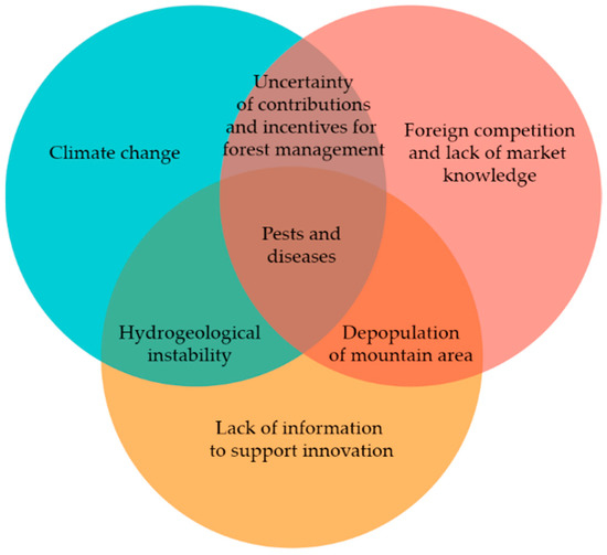 Finally, further threats relate to the insufficient recognition of forest services and the lack of self-supporting capacity of supply chains, unless with public funding, often lacking in this area (Figure 5).