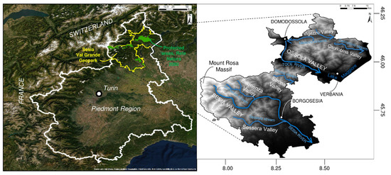 Geographical location of the Sesia-Val Grande UNESCO Global Geopark. On the left, the position of the SVUGG within the Piemonte Region with the protected area’s location; on the right, the Digital Terrain Model (5 m resolution, source Geoportale Regione Piemonte; http://www.geoportale.piemonte.it/geocatalogorp/?sezione=catalogo) highlighting the articulation of the relief in the geopark with the main streams, lakes, and peaks.