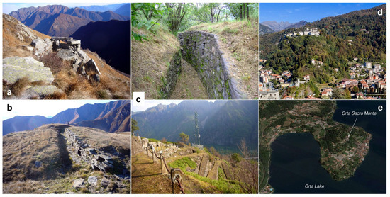 Example of geomorphological features characterizing the Sesia Val Grande UNESCO Global Geopark: (a) Tagliaferro peak in Sesia Valley; (b) incised tributary stream of the Pogallo Valley; (c) linear stream at Balmuccia (Sesia Valley); (d) Unipiano and Sacro Monte di Varallo glacial terraces; (e) Toce river mouth in the Maggiore Lake, with the Montorfano peak on the right.