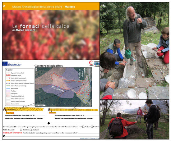 The importance of fieldtrips has been underlined since a long time having the function of a “direct experience with concrete phenomena and materials” [24]. When fieldtrips are then intended for schools, moreover, a learning-by-doing approach is favored, including the activity of “observation, identification, measurements and comparison” [24,25,26]. Bollati et al. [27], for example, proposed a multidisciplinary approach to physical landscape reading, based on the use of vegetation, to reconstruct the evolution of landforms (i.e., dendrogeomorphology) along a geotouristic itinerary. This kind of approach towards physical landscape evolution under geomorphic processes action, and its different responses according to geodiversity, could also be useful to people for hoping to gain awareness of Earth as a complex system, whose dynamics may induce hazards and risks [27,28,29]. If these experiences are then proposed in iconic sites (i.e., geosites of national or international relevance; [30]) they acquire even more efficacy.