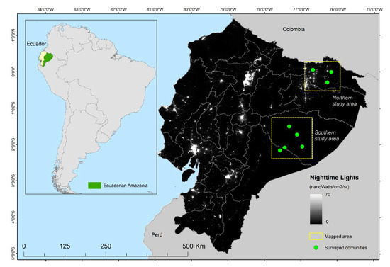 We selected two larger study areas (Figure 1) covering seven out of the ten nationalities of Ecuador (i.e., Kichwa, Shuar, Achuar, Siona, Secoya, Cofan and Sapara). Figure 1 shows the nighttime lights based on the Visible Infrared Imaging Radiometer Suite (VIIRS) as well as the two study areas. Some sources of light within the northern study area are visible. However, some communities nearby still do not have access to electricity. Wide rivers and orography still pose a barrier to extend the grid, and some of those lights are caused by gas flares from oil platforms [20].