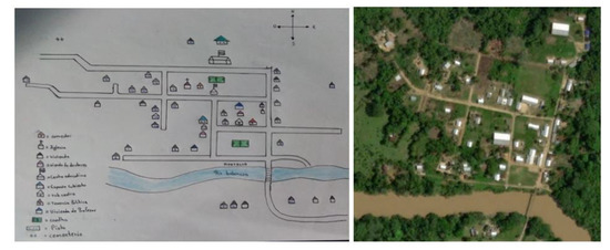 We trained eight indigenous technicians who surveyed a total of 49 communities and 725 households from March to June 2019. Data were collected using the app Geofarmer (http://app.geofarmer.org) [21]. The app allowed technicians to store the survey data, geolocate it, and upload it to the server once internet connection was reached. Structured interviews with each community leader were conducted to gather information on environmental changes about the living conditions, but also about needs and wishes of the community—e.g., number of people and population distribution, number of households, number and type of infrastructure built and to be built and prices of different types of fuels. Besides, another survey was carried out in approximately 10% of the households of the communities with information related to the habits of consumption and needs of energy—e.g., expenses incurred in fuel (gas, gasoline, diesel), number of batteries and candles used or type of electrical appliances they would like to have. These questions have been used to calculate a demand of electricity per household and to develop the electricity model, which will be presented in a separate paper, currently under preparation. The technicians also prepared conceptual maps of each community visited that were used to assess the results of our maps and to better interpret the VHR images (Figure 2).