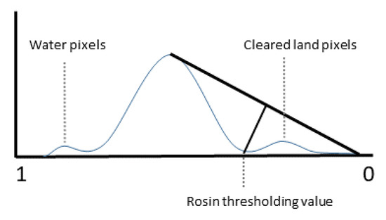 In the next step, we established a threshold that separated the lowest TCW values corresponding to the settlements. Histogram thresholding methods can be used to separate different types of classes of values according to their frequency. We used two of such methods. One is the Otsu (1979) [29] thresholding method. It maximizes the inter-class variance based on the observed distribution of pixel values. It has been used before to separate water bodies (with high TCW values) from land masses (lower TCW values) [30]. Because we masked out the water pixels using the GSW layer, the threshold that maximizes the interclass variance now is the one between settlements (low TCW values) and forest mass (high TCW values). While this method is appropriate for bimodal distributions, sometimes images can show a unimodal distribution. In this case, the Rosin (2001) [31] thresholding method is more appropriate. It traces a line between the peak of the histogram to the higher end of the histogram (Figure 3). The threshold point is the one that maximizes the perpendicular distance between the line and the histogram. We also applied this method to our TCW image, inverting first the histogram in order to comply with the assumption of this method. The method assumes that there is a dominant class that produces a peak in the lower end of the histogram (forests) and a secondary population at the higher end (cleared land) (Figure 3). After retrieving the threshold value, the image histogram was reverted to its original distribution.