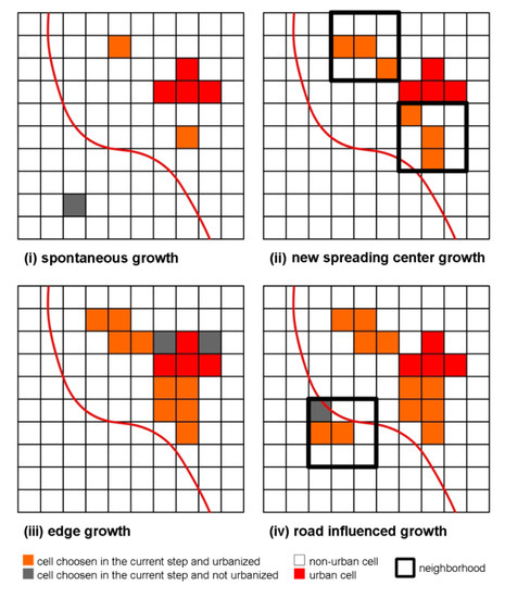 Cellular Automata (CA) are one of the most popular simulation tools in geography. Their handling is simple and, at the same time, they are able to capture complex patterns of development [33,34]. In Clarke’s Urban Growth Model [35], more commonly known as SLEUTH, urbanization is seen as a diffusion process of complex urban patterns. It has been applied in urban growth studies all over the world [36,37,38,39]. SLEUTH is an acronym of its initial input factors: slope, land use, exclusion (in our case water bodies), transport, and hillshade. Five growth coefficients (dispersion, breed, spread, slope, road gravity) define four growth rules—spontaneous growth, reflecting the random emergence of new urban areas, new spreading center growth, edge growth depicting urban sprawl, and road-influenced growth. The last one is SLEUTH-specific and relocates a temporary cell along the road to its final position (Figure 4). Space and time are treated discretely in the CA. One growth cycle represents one year of urban growth and consists of the four aforementioned subsequent growth rules. Each selected new urban cell is compared to the local slope and exclusion information as well as a random value. The growth coefficients are defined during the calibration process. Every parameter combination of the particular growth coefficients between values of 0 to 100 is tested until the optimal balance is assessed. In his thesis, Goetzke (2011) [40] modified the urban growth model and implemented it into XULU (eXtendable Unified Land use Modeling Platform), a modeling environment developed at the University of Bonn [41]. The standard calibration evaluation method has been replaced by the multiple resolution validation (MRV) [42]. Thus, the urban land-use input is reduced from five to two.