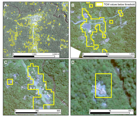 The use of the TCW to identify settlements worked in a specific environment, such as the Amazon rainforest, because water indices are sensitive to the removal of vegetation and the water it contains [25,26,27]. Low TCW values were also found high up in the Andean mountains where vegetation cover is very low. These were not part of our study area but could be masked out using altitude criteria.
