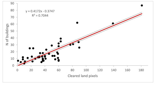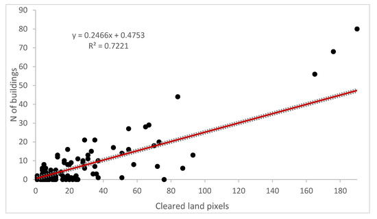In order to transform the cleared land into the number of buildings, we applied the linear relationship derived from Figure 6 (Equation (1)) between the number of buildings and cleared land pixels, which is the one with a higher adjusted R2 and higher number of samples (n = 149):