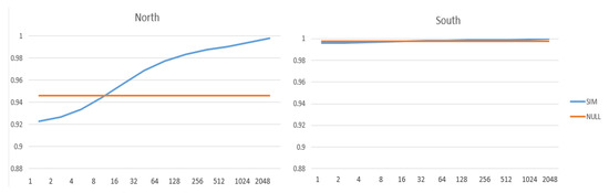 Table 3 presents the results of the settlement simulation. The model has been calibrated by using the settlements of 1990 as the start year and 2000 as the final year. The validation was performed using the settlements for 2018 (Table 1). Calibration was carried out with the implemented multi resolution validation [42]. The Ft value represents the mean overall agreement weighted over different resolutions. It is a very good measurement for balancing the error of quantity and error of location. The error of location is regularly higher when it comes to land use modeling since the change rate is very often lower than the persistence signal. However, both values—calibration and validation–show very high accuracies. In order to obtain a better impression of the model’s performance, we also measured the hits, misses, false alerts, and correct rejections. The specificity outperformed the sensitivity, meaning the prediction performance of no-change is very high (0.96/1.0), while the prediction performance of change is just average (0.54/0.57), shown in Table 3. The Kappa indices reveal accuracies better than random indices, but the location error is too high compared to the error of quantity. Therefore, Fuzzy Kappa is a good validation index because it considers the fuzziness of urban growth simulation. When not hitting settlement growth correctly pixel-by-pixel, Fuzzy Kappa mirrors how good the model hits the right neighborhood at least. The null model validation again depicts how good the model performs in comparison to a so-called null-model, simulating no-change at all. Due to the very high accuracy from the highest resolution—i.e., 30 m, and due to a low change signal—the null resolution—i.e., the resolution where the model outperforms the null model—is reached for south and north study areas at a points eight-times the original resolution—i.e., 240 m (Figure 8).