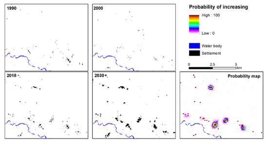 Example of settlements mapped for 1990, 2000, 2018, and its projection for 2030 along with the probability of settlement growth.