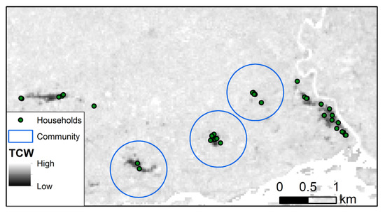 We got high correlation values and coefficients of determination between cleared land and number of buildings observed in the VHR imagery (Figure 6 and Figure 7). However, these values were lower when comparing the cleared land pixels 500 m around the center of the community against the number of buildings reported by the survey (Table 2). This is partly caused by some houses that belong to the same community (and reported in the community surveys) but which are further away than the 500 m radius established (Figure 10). Enlarging this radius further would cause an overlapping of adjacent communities.