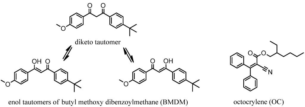 Chemical structures of butyl methoxy dibenzoylmethane (BMDM) and octocrylene (OC).