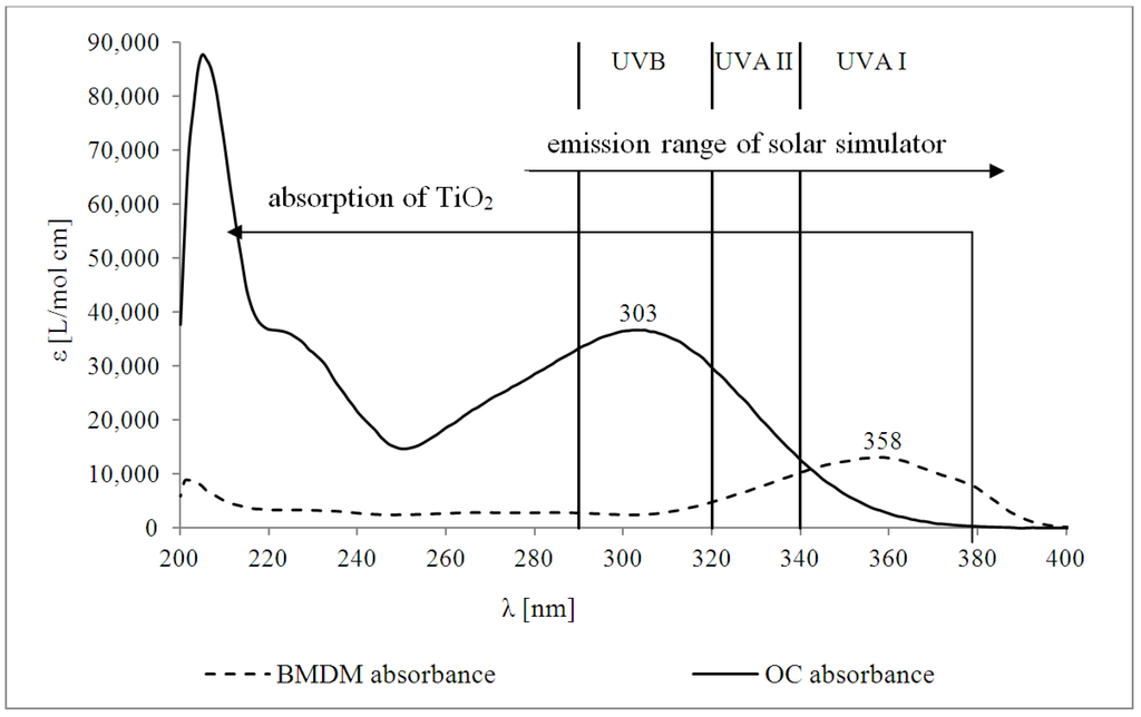 Figure 2 shows the UV-absorption spectra of BMDM and OC in methanol with the molar absorption coefficient (ε) plotted against the wavelength (λ). The dominant enol-form of BMDM exhibits a maximum at 358 nm and for OC the maximum is at 303 nm. TiO2 absorbs UV-light in the UVB and UVA II range, but is less effective in the UVA I range, with absorption depending on particle size []. The solar simulator, using the D65 filter, emits wavelengths ≥290 nm, including UVB-, UVA I- and UVA II-light, which allows effective excitation of all UV-filters.