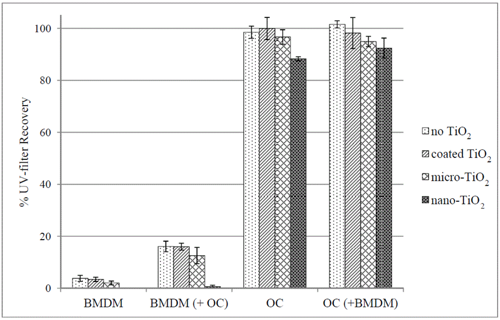 In combination with OC, the photostability of BMDM generally improved and recovery without TiO2 and with coated and micro-TiO2 was increased to more than 12% (entries 9–11). Despite this improvement, this percentage recovery does not lie within the acceptable range (90%–120%) required for the UV-filter concentration in a sunscreen product []. Photostability again decreased in the presence of nano-TiO2 and less than 1% of BMDM remained after the irradiation period (entry 12).