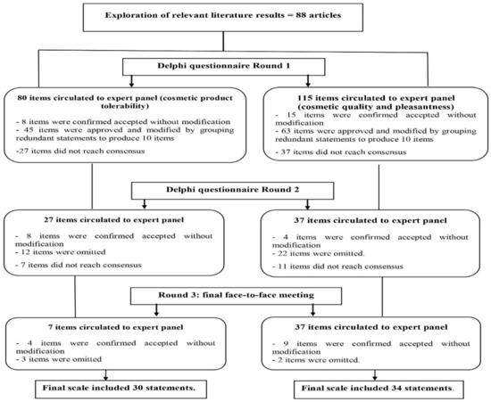 The aim of this research was to create and validate a cutaneous acceptance and tolerance scale for assessing the tolerability, safety, and pleasantness of a cosmetic product. The modified Delphi approach was used in this investigation. This method involves an iterative process that employs a systematic progression of repeated voting rounds performed by experts with sufficient knowledge and understanding of the subject matter [39]. Between January and August 2022, a three-step modified Delphi technique was used in the consensus process [40,41]. Initially, a thorough list of issues was determined, and a consensus was reached using the input offered by knowledgeable participants from the previous rounds. Two rounds of online surveys and a final face-to-face meeting were performed. The Delphi approach is derived from a modified Ebel technique [42,43,44] and is also known as the Estimate-Talk-Estimate process [45]. The final in-person meeting was not a part of the original Delphi method created by Dalkey and Helmer in 1963 [44].