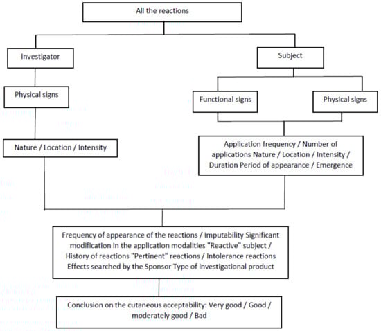 The last in-person meeting was also utilized to build and create a generic, systematic approach that would allow patients to report both functional and physical symptoms in addition to those discovered during an examination (clinical signs). The confrontation of these symptoms determines whether the investigated cosmetic product is ultimately cutaneously acceptable (Figure 2).