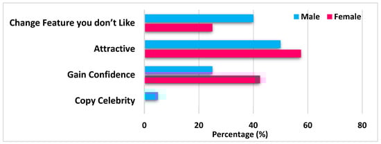 The participants’ main reason for undergoing cosmetic procedures was ‘to look attractive’ (females: 62%; males: 50%), as presented in Figure 1, followed by ‘to gain confidence with an enhanced physical appearance’ (females: 42.2%; males: 25%) and ‘to change features which they did not like’ (females: 24.4%; males: 50%). None of the female participants wanted ‘to copy a celebrity or look like them’, whereas 10% of men wanted to look like a celebrity.