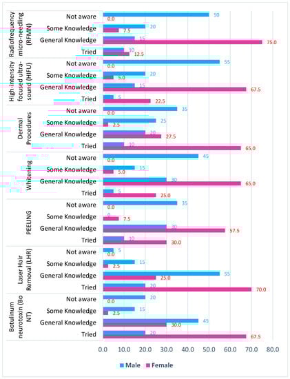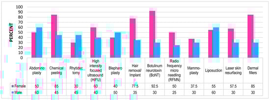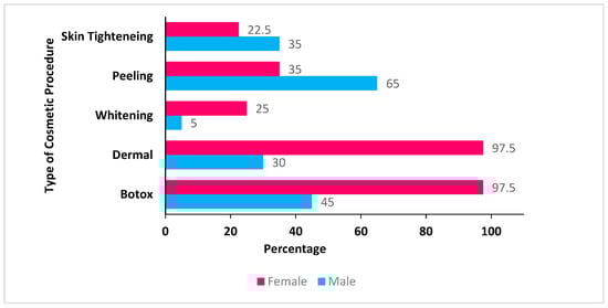 Some participants stated that they would be willing to undergo specific procedures if given the opportunity and with the necessary resources (money) covered. Around 97.5% of female participants voted for the dermal filling and BoNT procedures, whereas 45% of male participants opted for BoNT and 30% opted for dermal fillers. More male participants voted for peeling and skin tightening than females (Figure 6).