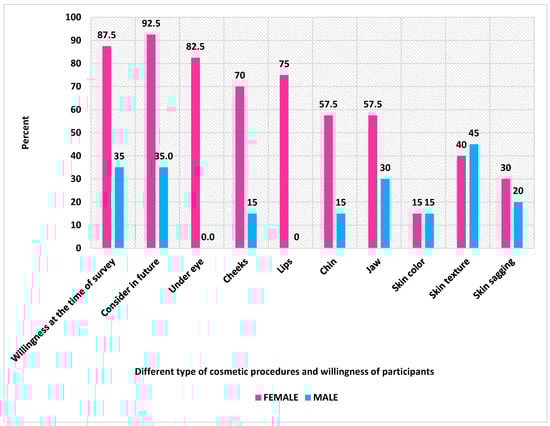 Participants who had not undergone a CP were asked about their willingness to undergo a CP. More females were more interested in enhancing their physical appearance through different CPs than males. When the participants were asked about their willingness to undergo a procedure, 35% of male participants were willing to have a procedure done, whereas 87.5% of females said they required it now, and 92.5% said they were willing to have it done in the future (Figure 4). Most female individuals who visited the clinic were interested in under-eye procedures, accounting for around 82.5% of people who underwent this procedure, whereas none of the males had undergone this procedure. A similar result was observed in lip procedures, where 75% of the individuals in the survey had undergone lip enhancement with lip fillers; however, none of the male individuals had. Female participants (70%) primarily opted for cheek fillers, a procedure also known as cheek augmentation, whereas only 15% of male participants had undergone this procedure. The percentages of female and male individuals who had enhanced their jawlines were 57.5% and 30%, respectively. Around 57.5% of females and 15% of males had enhanced their chins using chin filler to give shape and enhance the jawline. More male participants (45%) had undergone skin texture procedures than females (40%). Around 30% of women and 20% of men had undergone various processes for their sagging skin. Skin whitening procedures were less popular than other procedures (15%), as fair/light skin predominated in this population sample. Many people were interested in improving their appearance by enhancing their under-eye area and sculpting their jaw, cheeks, and chin, giving them a defined and well-structured profile or physical appearance.