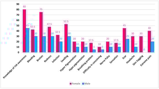 The awareness level among the participants regarding adverse effects or risks associated with procedures is shown in Figure 5. Few men knew about the adverse effects of sagging skin procedures, whereas 30% of women knew about them. Most females (73.3%) and 30% of males were aware of the risk of bruises and edema, whereas 50% were aware of the risk of redness after the procedure. Almost half of the women and one quarter of the men were aware that some procedures might lead to scarring or bleeding. A few participants (20% of females and 10% of males) were aware of both hyperpigmentation and hypopigmentation. Some females (30%) knew about the side effects of sagging skin and headaches, while only 10% of males knew about headaches.