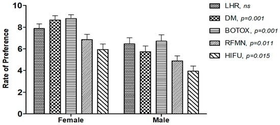 In this section, participants were asked their opinion on the effectiveness of the procedures on a scale from 0 to 10. The results indicate no significant differences in opinion regarding the effectiveness of laser hair removal, while for dermal procedures, BoNT, RFMN, and HIFU, female participants graded their effectiveness significantly higher than male participants (Figure 7).