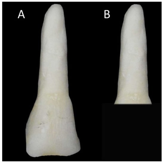 Cleaned bovine tooth (A) and decoronated tooth (B).