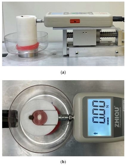 A custom-made splitting force measuring device was used to measure the intracanal lateral forces []. The device used in the present in vitro study consisted of a high-precision digital force gauge (DS2-50N, Zhique Precision Instruments, Shanghai, China) mounted on a linear sliding table (Figure 4a). The measuring end of the device was connected to the cylindrical Teflon holder that contained the two-piece sample in intimate contact during the testing procedures. The resulting assembly registered any lateral force applied between the two pieces of the specimen with an accuracy of 0.01 N. The sliding table permitted precisely reaching a 0 N force reading before initiating the instrumentation (Figure 4b). The principle of the splitting force platform is based on detecting horizontal (lateral) splitting forces resulting from a given procedure within the radicular canal. This was performed through force transmission from the terminal probe to the force-measuring device.