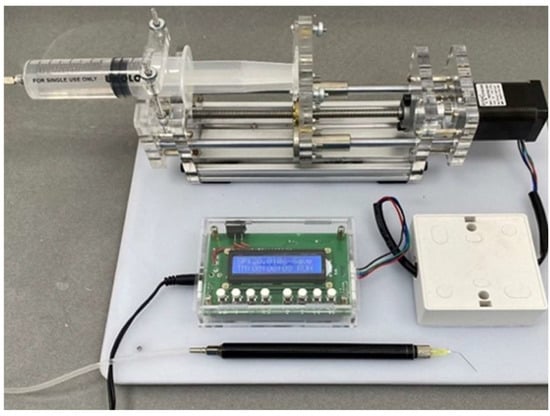 The initial canal preparation used the TruNatomy glide path file (Dentsply Sirona, Maillefer, Ballaigues, Switzerland) and 1 mL of sodium hypochlorite (NaOCl) 1.3% concentration irrigation through a side vented needle over 6 s utilizing a custom-made irrigation device at a rate of 10 mL/min (Figure 5). This step aimed to create a standardized canal in all samples before the preparation process. An endodontic motor (X-Smart Plus, Dentsply Maillefer, Switzerland) was set to the manufacturer’s pre-settings. After each file/stroke in both groups, NaOCl irrigation was delivered to the canal at a rate of 10 mL/min.